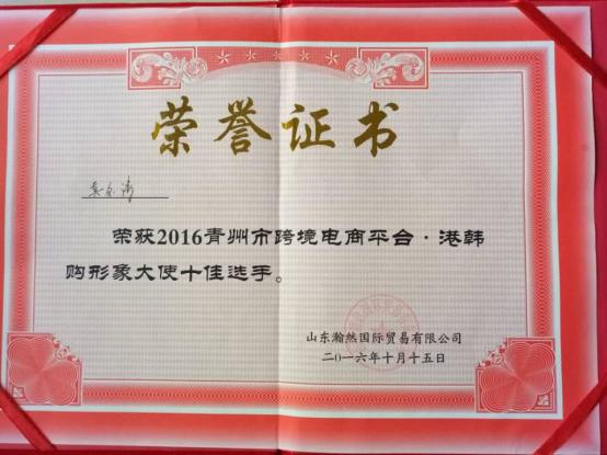 比赛通过自我介绍和表演才艺来选出形象大使,我院莫金涛同学选择了跳现代舞的才艺展示,青春的活力张扬四射,代表着创业者的热情与希望。比赛结束后颁发了2016青州市跨境电商平台“港韩购形象大使十佳选手”荣誉证书。在比赛过程中,同学们发挥了自己的特长与优势,通过一个展示自己的舞台,展现出了当代大学生的风采。