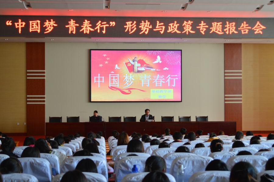 10月17日下午,基础教学部在南校区报告厅举办了题为“中国梦 青春行”的形势与政策专题报告会,主讲教师是基础教学部姬莹老师,报告会由基础教学部负责同志主持,各院系2013级学生代表和辅导员老师参加了此次报告会。