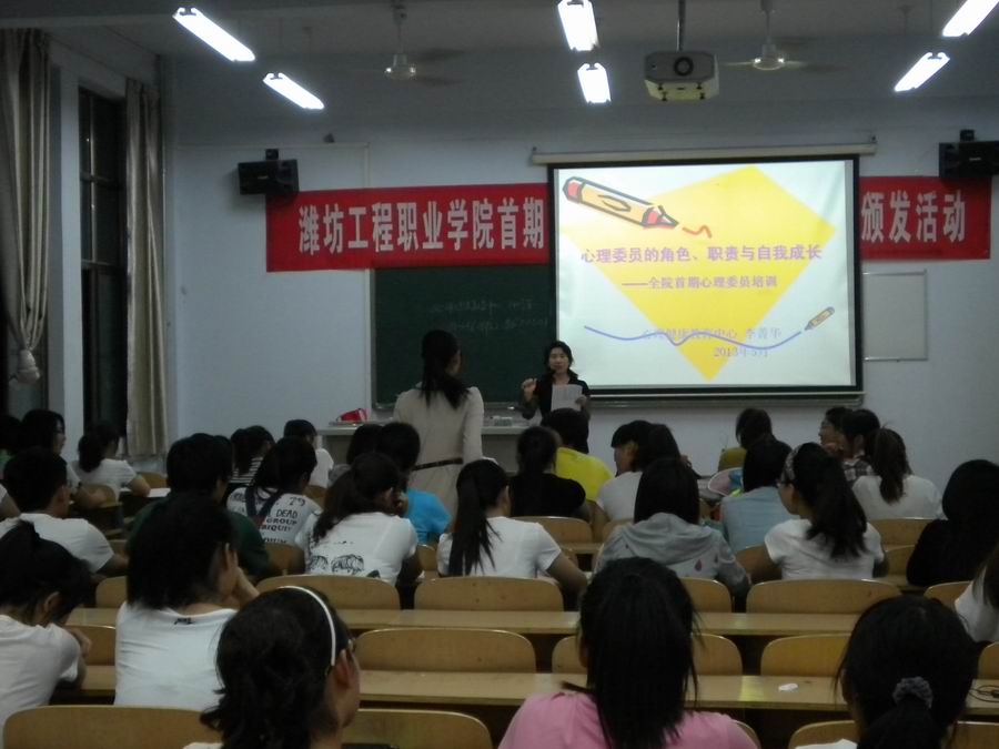 5月21日晚,“5.25”全国大学生心理健康日到来之际,我院基础教学部在1302多媒体教室举行了首期班级心理委员上岗培训班。本次培训由基础教学部心理健康教育中心心理咨询师李菁华老师主持,各院系通过自荐与推荐结合选拔出的61名班级心理委员参加了培训。本次培训内容主要围绕“心理委员的意义、角色定位、职责以及心理委员的自我成长”展开。活动历时2个半小时,整个过程师生畅谈互动,严谨而温馨。