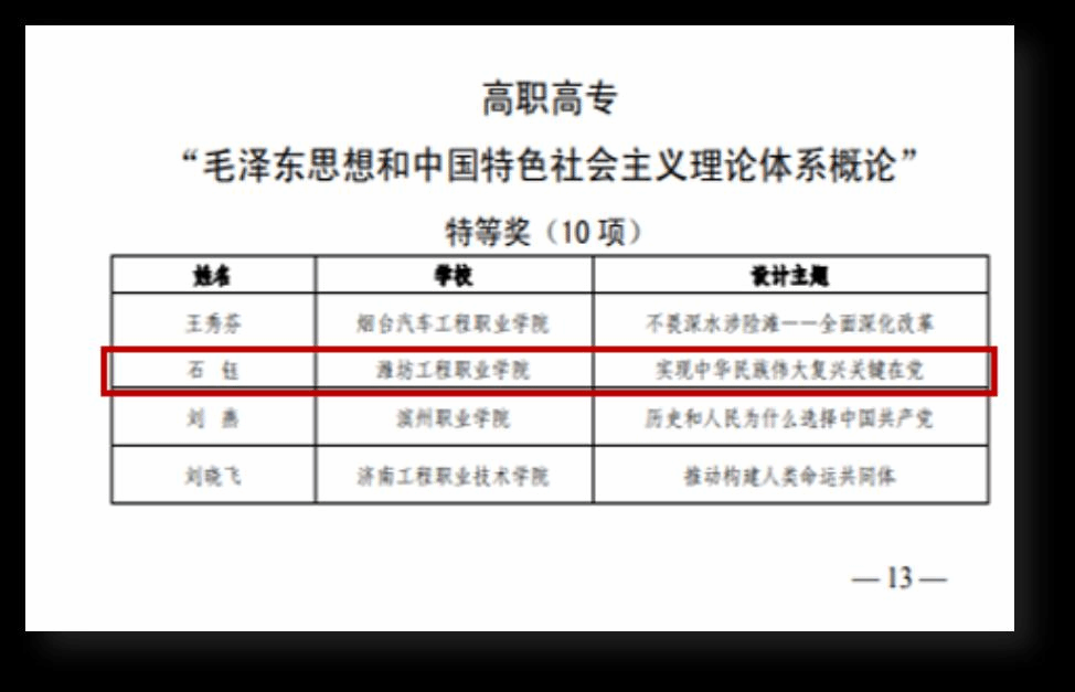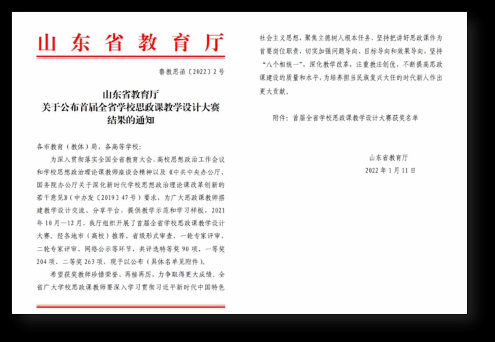 为深入贯彻落实全国全省教育大会、高校思想政治工作会议和学校思想政治理论课教师座谈会精神以及《中共中央办公厅、国务院办公厅关于深化新时代学校思想政治理论课改革创新的若干意见》要求,为广大思政课教师搭建教学设计交流、分享平台,提供教学示范和学习样板,2021年 10 月—12 月,山东省教育厅组织开展了首届全省学校思政课教学设计大赛,我院思政课教师石钰荣获高职高专组《毛泽东思想和中国特色社会主义理论体系概论》特等奖。
